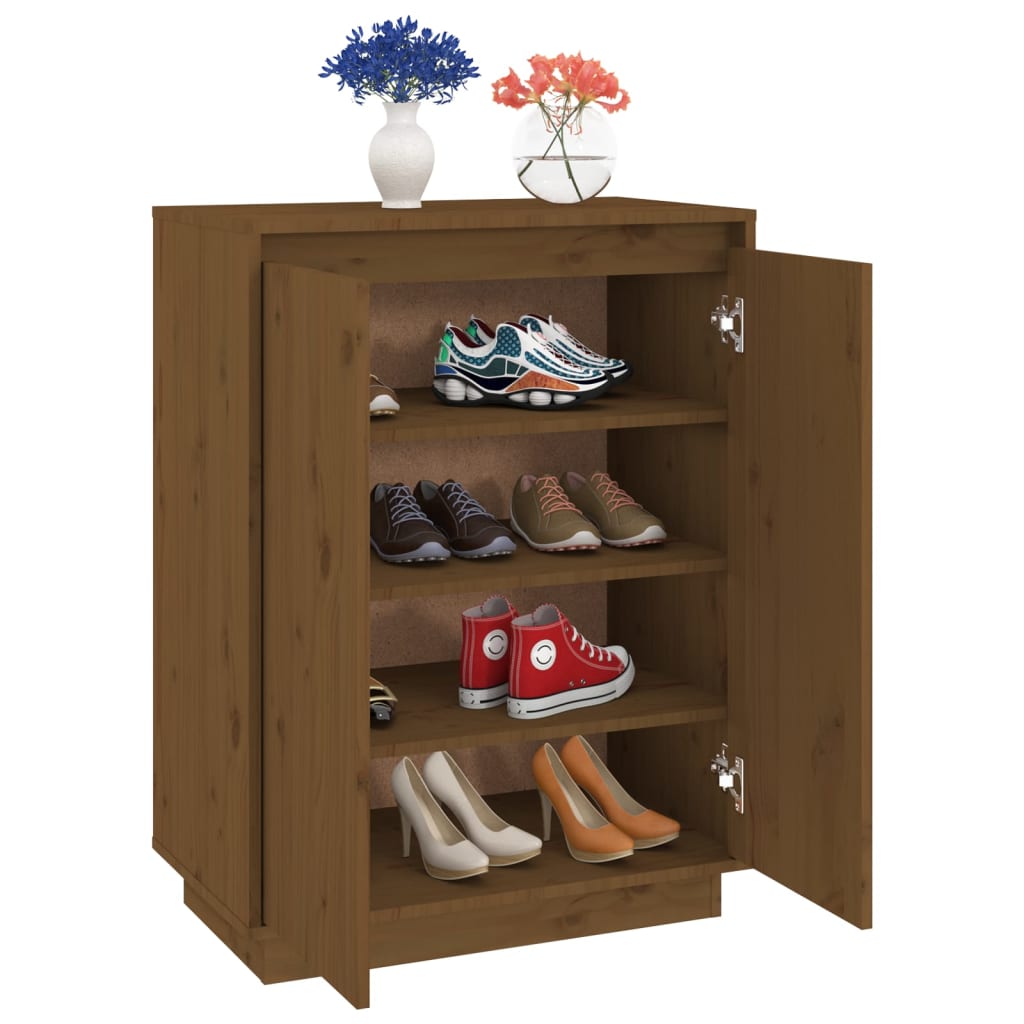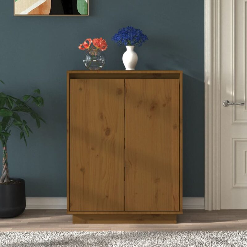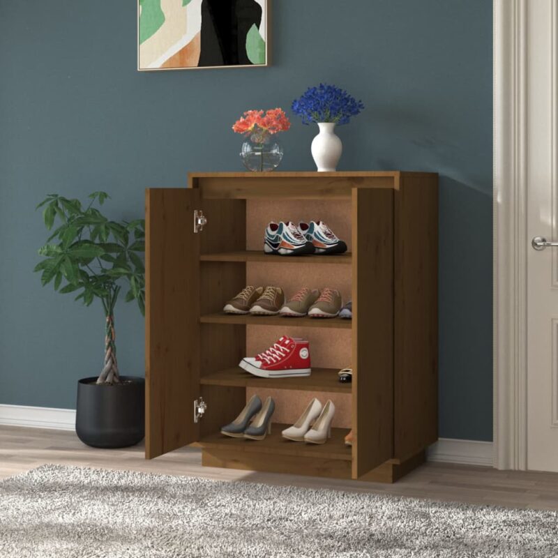 Optimisez le rangement de vos chaussures tout en apportant une touche d’élégance à votre intérieur grâce à cette Armoire à chaussures Marron miel 60x35x80 cm Bois de pin massif. Conçu pour la durabilité, le meuble est entièrement fabriqué en bois de pin robuste. Sa structure résistante vous offre un stockage accessible et efficace pour votre collection de chaussures tout en mettant à disposition un plateau supérieur pour mettre en valeur vos objets de décoration favoris, qu’il s’agisse de cadres photographiques ou de verdure.