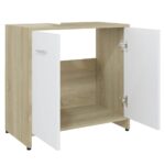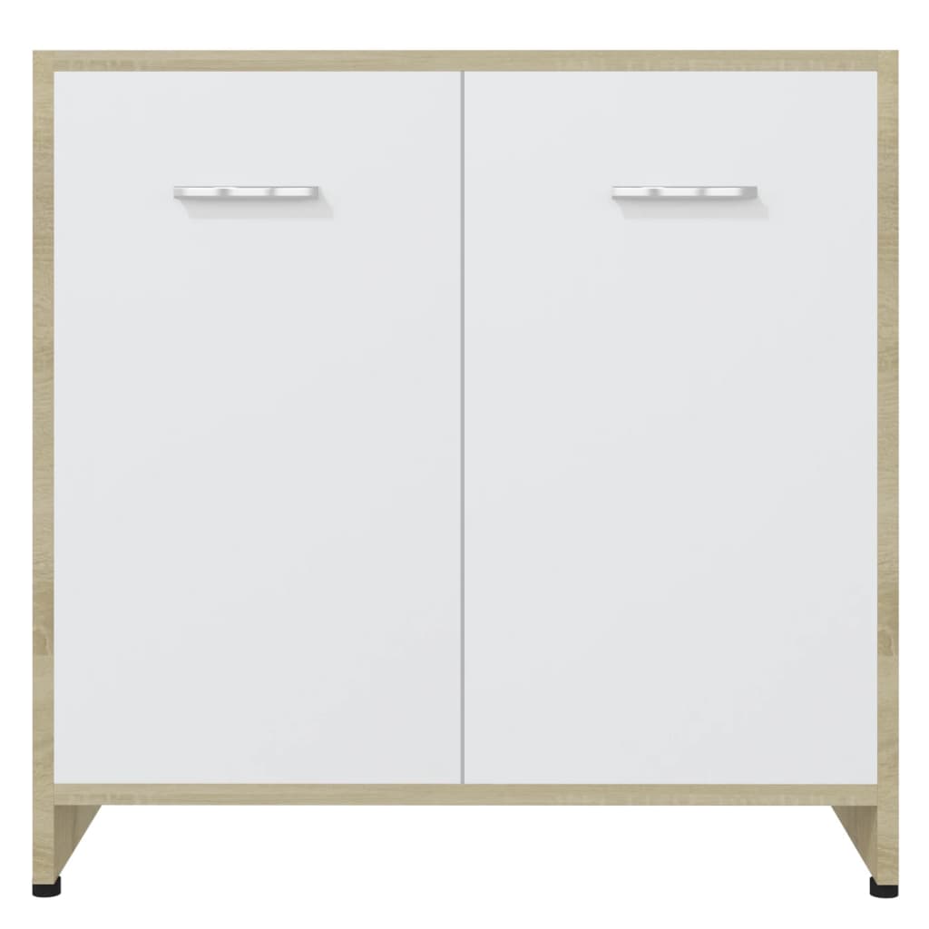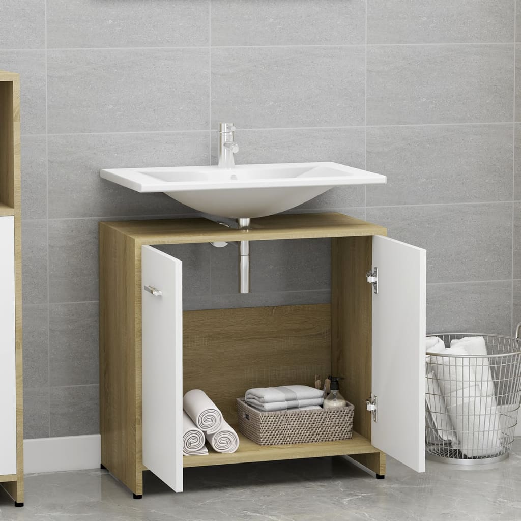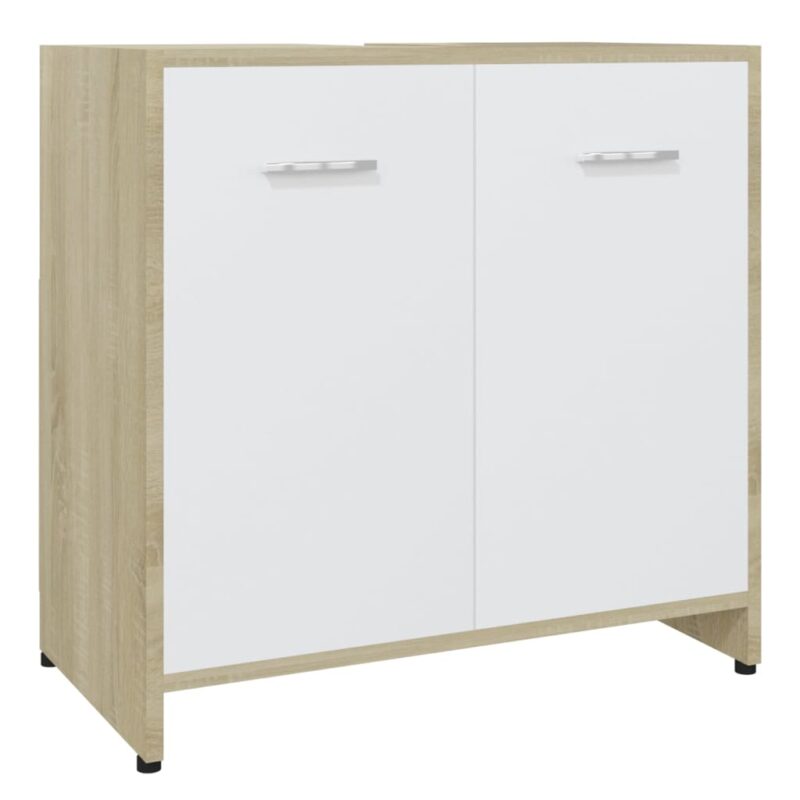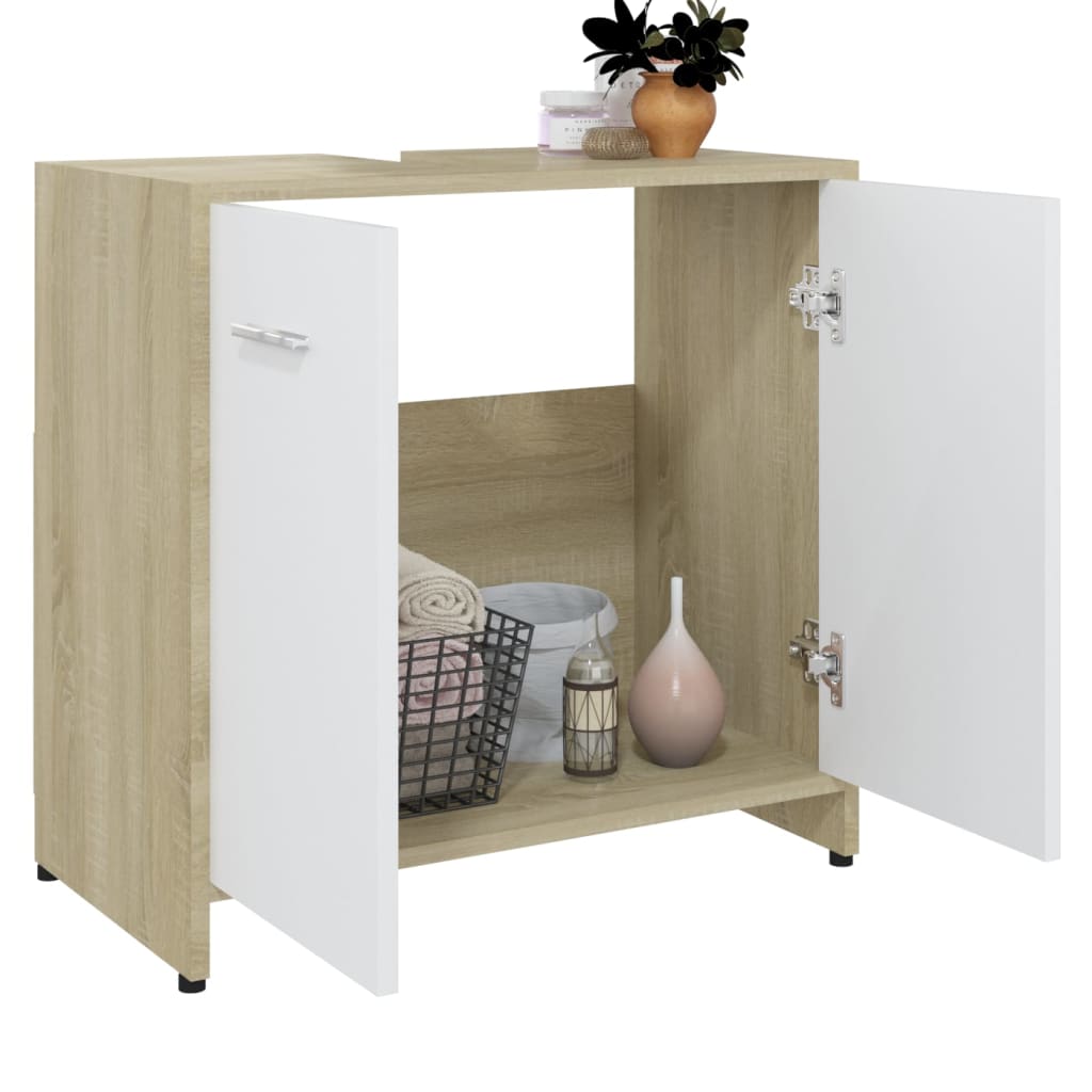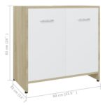 Tirez le meilleur parti de votre salle de bains grâce à notre Armoire de bain Blanc et chêne sonoma 60x33x61 cm Aggloméré. Son style chic et ses lignes sobres s’harmonisent aisément avec différents décors de salle de bain tout en offrant une solution de rangement fonctionnelle. Fabriquée à partir d’aggloméré, cette armoire allie durabilité et stabilité pour un usage prolongé. Elle est composée d’un compartiment et de deux portes, munies de poignées pratiques pour un accès aisé, afin de ranger aisément vos affaires de toilette. Le nettoyage se fait en toute simplicité avec un simple coup de chiffon humide.