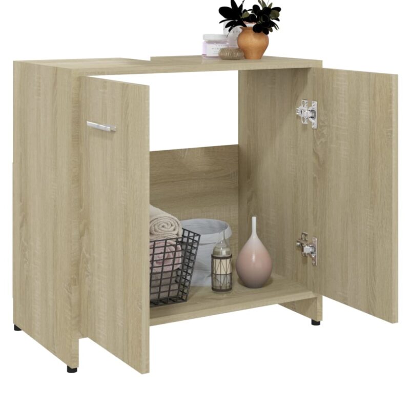 Dotez votre salle de bain d’un rangement supplémentaire doté d’une esthétique soignée et harmonieuse grâce à cette Armoire de salle de bain Chêne sonoma 60x33x61 cm Aggloméré. Son design raffiné aux lignes épurées se mariera aisément avec le décor de votre intimité. Fabriquée à partir de panneaux d’aggloméré, cette pièce d’ameublement assure à la fois stabilité et durabilité. Sa structure comprend un compartiment unique et deux portes qui dévoilent un espace généreux, idéal pour organiser vos accessoires de salle de bain. Les poignées facilitent l’accès tout en ajoutant une touche de sophistication. L’entretien est un jeu d’enfant, un simple coup de chiffon humide suffit pour la maintenir comme neuve.