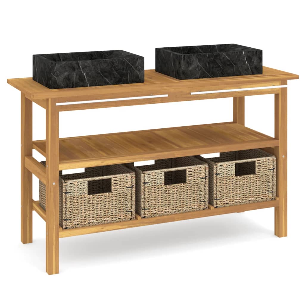 Transformez l’aspect de votre espace d’eau avec une Armoire de salle de bain et lavabos en marbre noir Teck massif, conjuguant une esthétique épurée à une fonctionnalité impeccable. Façonnée à partir de teck massif, cette armoire n’est pas seulement résistante, mais devient également une base solide pour y disposer vos lavabos en marbre ainsi que vos indispensables de salle de bain. Ajoutez à cela une barre pour suspendre vos serviettes et des pieds surélevés pour une meilleure aération et stabilité, et vous obtenez un meuble aussi pratique qu’attrayant.