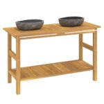 Découvrez le raffinement et la praticité combinés avec notre armoire de salle de bain et lavabos en pierre Teck massif. Ce meuble double vasque, fabriqué avec soin en teck robuste, ne manque pas d’élégance et assure une intégration harmonieuse dans votre espace d’eau. Avec ses dimensions bien pensées, il apporte une solution de rangement optimale sous le plan de vasque, tout en permettant une utilisation quotidienne agréable et un entretien facile. Son design épuré se voit rehaussé par la singularité de chaque lavabo en pierre de rivière, dont la résistance et l’esthétique viennent parfaire cet ensemble.
