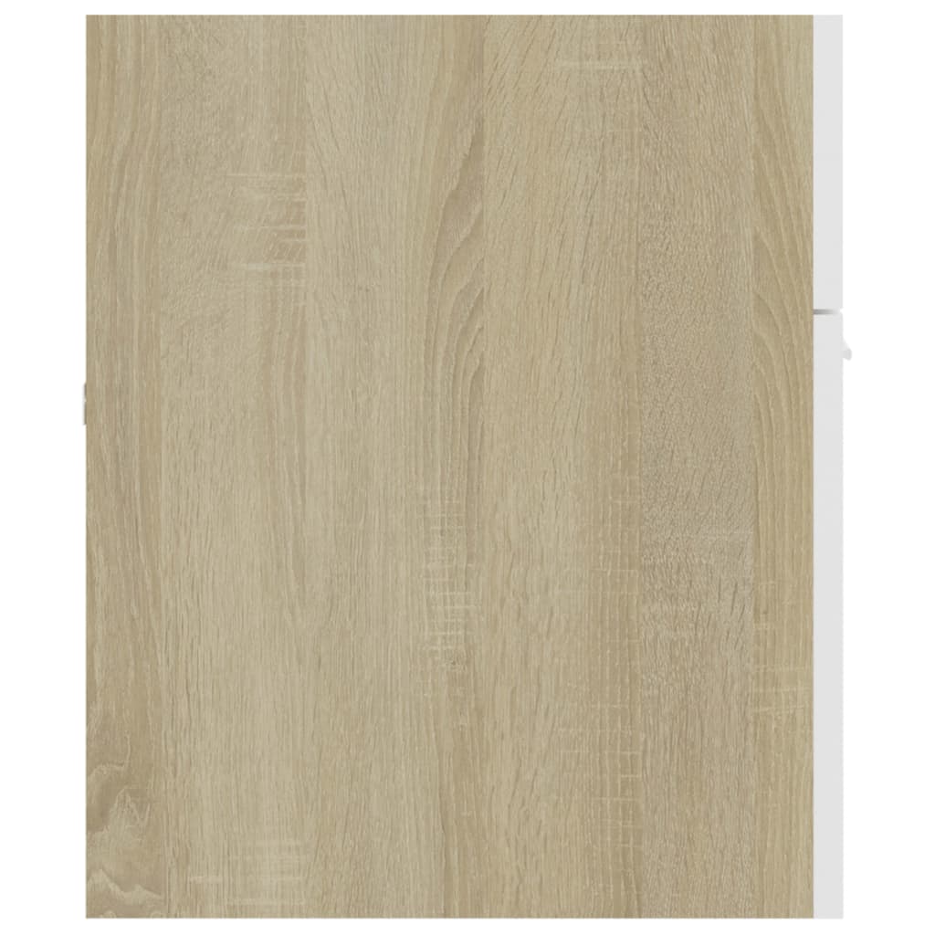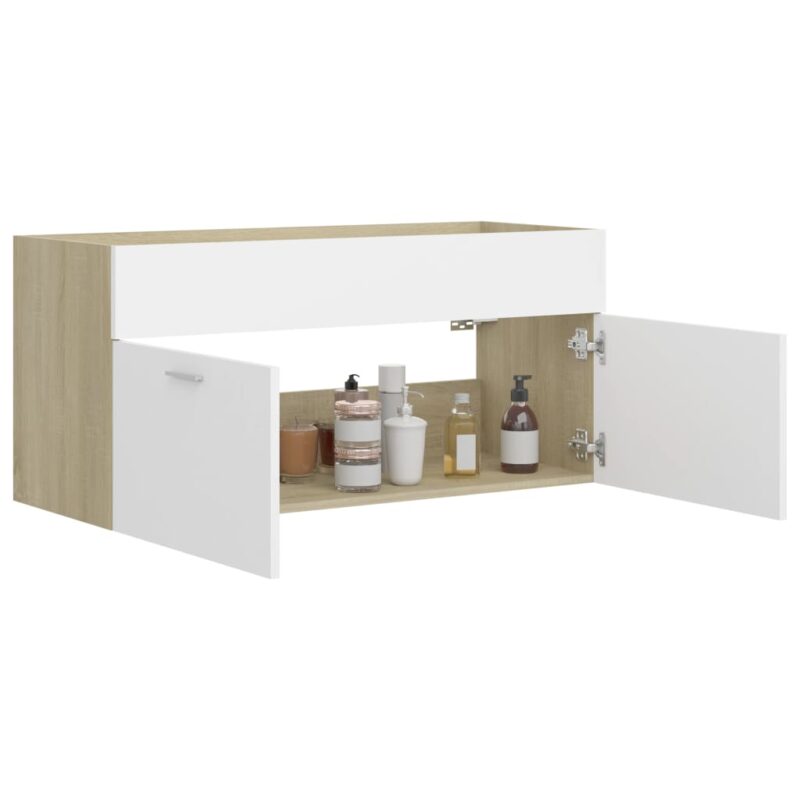 Transformez l’apparence de votre salle de bain tout en maximisant votre espace de rangement grâce à notre armoire d’évier blanc et chêne sonoma 100×38,5×46 cm en aggloméré. Son design contemporain, alliant simplicité et élégance, complémentera à merveille l’ambiance de votre salle d’eau. Sa confection en aggloméré de qualité lui confère à la fois durabilité et stabilité, promettant de longues années de service. Elle se compose d’un compartiment spacieux révélé par deux portes, offrant une ample capacité de stockage pour vos essentiels de toilette. Le plateau supérieur est spécialement conçu pour accueillir votre évier, avec la précision qu’il n’est pas inclus et devra être acquis séparément. Ce meuble se distingue également par son entretien aisée, un simple coup de chiffon humide suffit pour le maintenir impeccable.