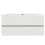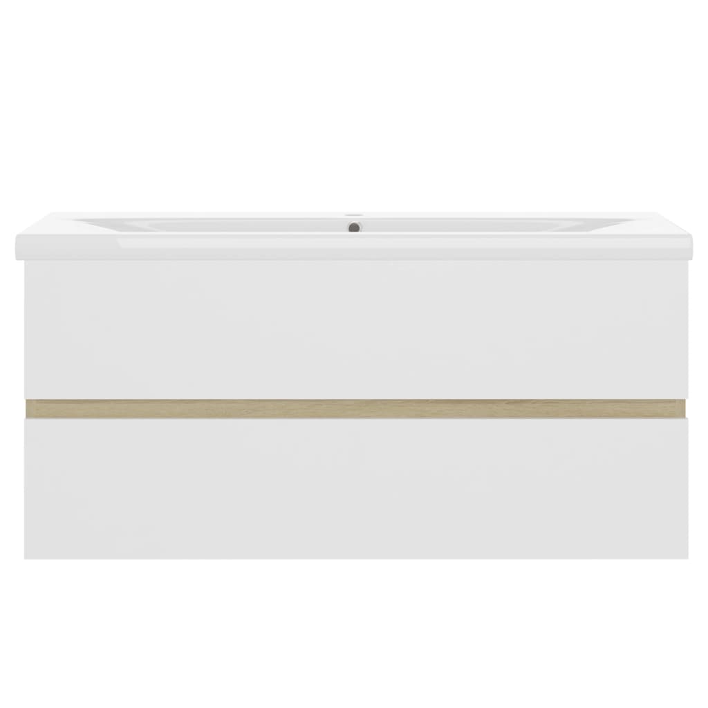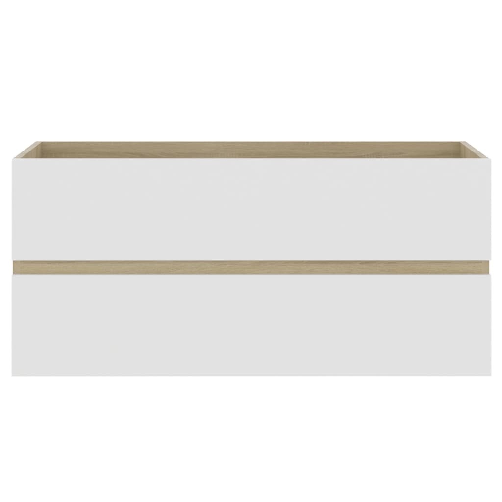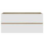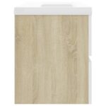 Détails de l’armoire d’évier et du lavabo intégré en aggloméré blanc et chêne sonoma