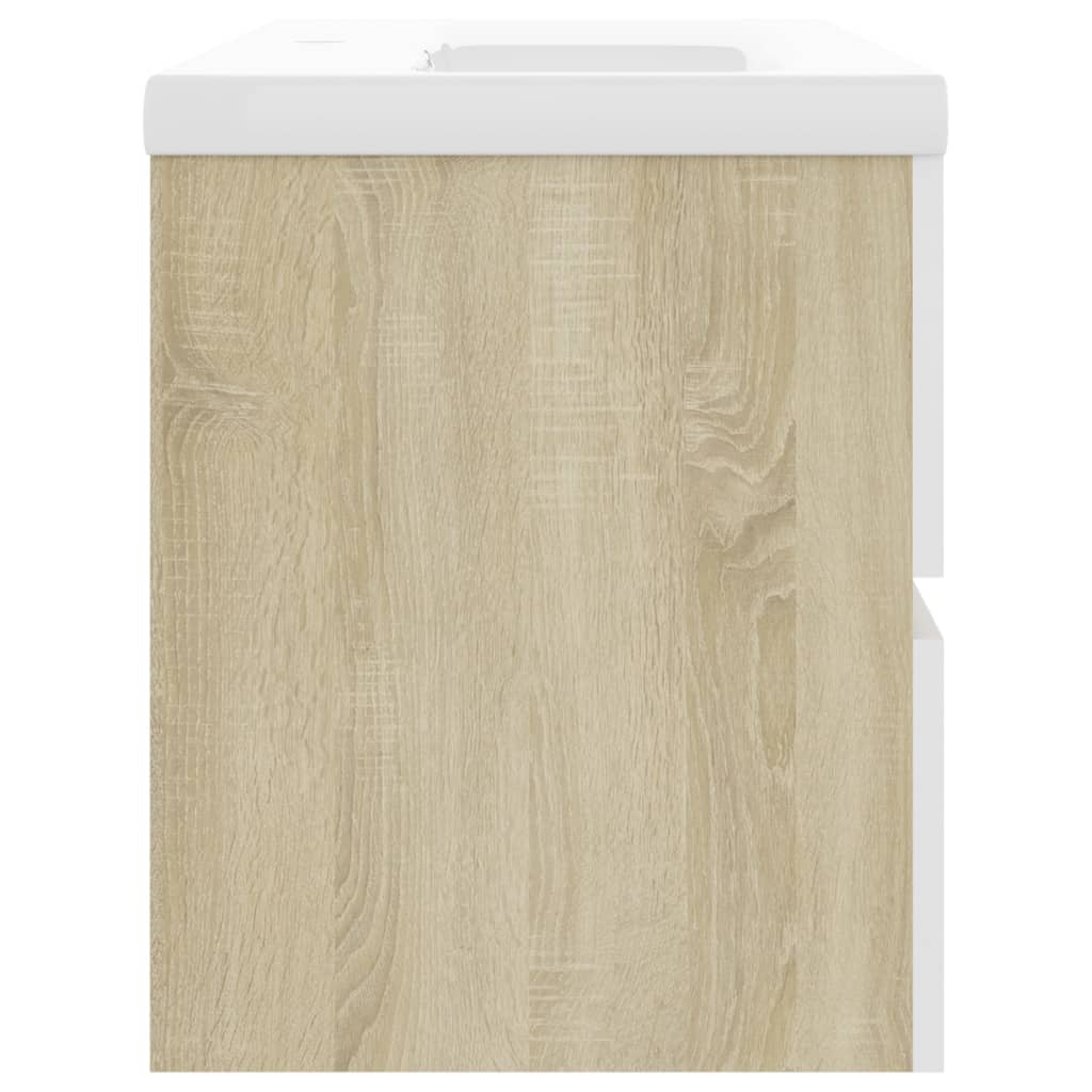 Transformez votre salle de bain avec cette élégante armoire d’évier et lavabo intégré Blanc/chêne sonoma Aggloméré, conçue pour apporter de la fonctionnalité sans sacrifier l’esthétique. Avec son tiroir spacieux, elle offre un espace de stockage pratique pour vos accessoires de salle de bain. Sa taille est parfaitement adaptée pour une utilisation sous l’évier, facilitant ainsi le rangement. Conçu en céramique durable, le lavabo apporte non seulement utilité, mais rehausse également l’aspect général de votre pièce. Son style audacieux s’harmonisera avec la décoration existante de votre salle d’eau, apportant une touche de modernité. De plus, le trop-plein intégré permet d’éviter les débordements. Sa finition lisse et brillante accentue son charme et simplifie le nettoyage. Notez que les éléments de robinetterie et de drainage sont vendus séparément.