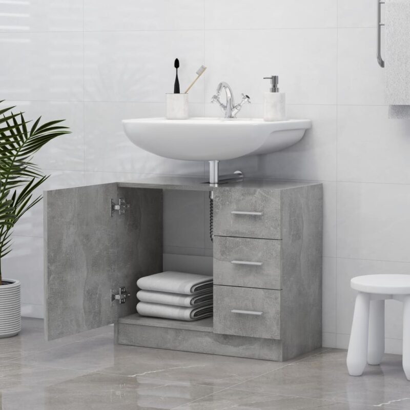 Introduisez un complément contemporain à votre salle de bains avec notre armoire d’évier Gris béton, conçue pour allier fonctionnalité et esthétique. Cet élément de mobilier de salle de bain au coloris tendance et à la texture imitant le béton se fondra harmonieusement dans votre décor. Sa structure en aggloméré assure durabilité et stabilité, promettant une longévité appréciable.