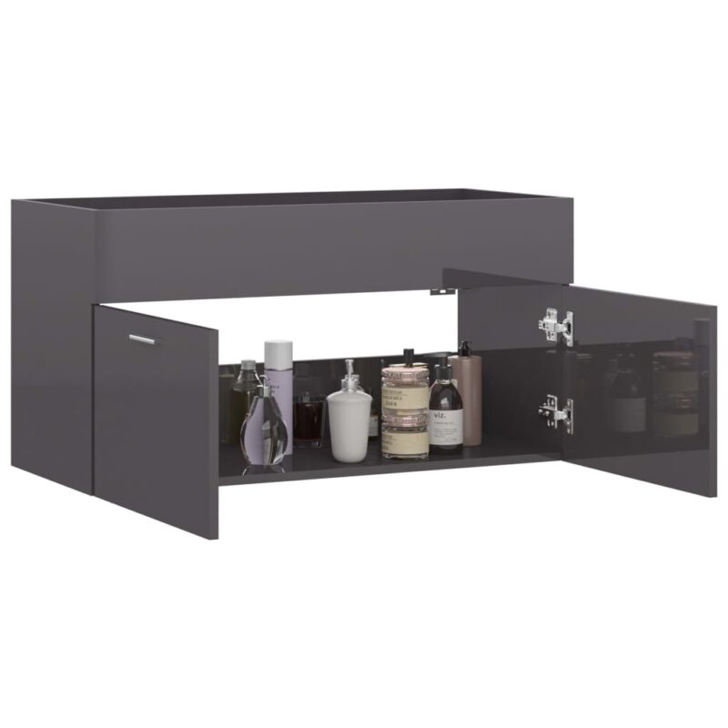 Offrez-vous une touche d’élégance et de fonctionnalité avec l’Armoire d’évier Gris brillant 90×38,5×46 cm Aggloméré. Conçue pour apporter un rangement optimal à votre espace aquatique, cette pièce saura embellir votre salle de bain avec son fini brillant et apporter de l’ordre grâce à ses capacités de rangement généreuses. L’armoire en aggloméré promet résistance et durabilité, vous assurant ainsi un investissement pérenne. Dotée d’un compartiment et de deux portes, elle cache en son cœur un vaste espace pour dissimuler tous vos accessoires de toilette. Son plateau supérieur est spécialement conçu pour accueillir un évier, permettant une intégration harmonieuse et pratique. Un simple coup de chiffon humide suffira pour entretenir sa surface lumineuse.