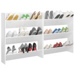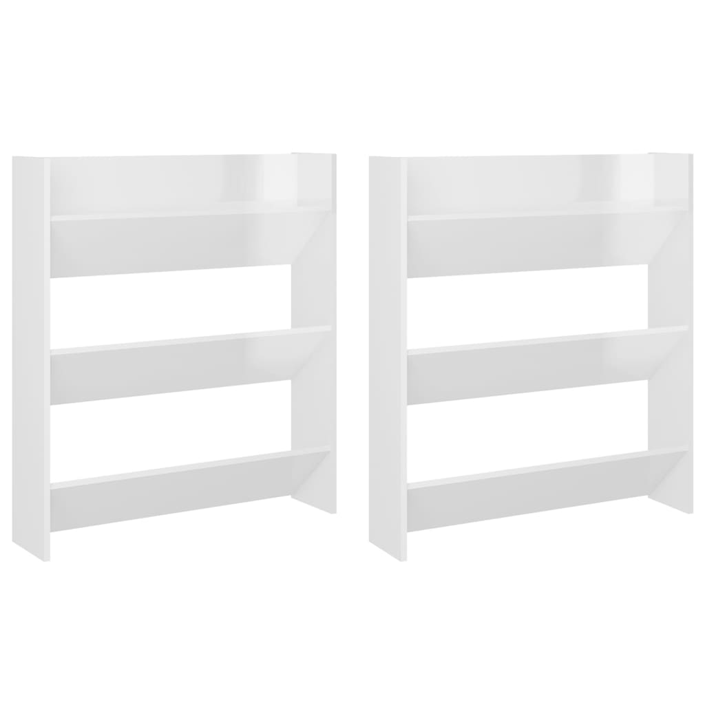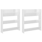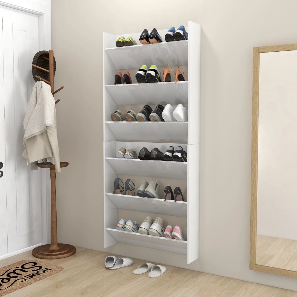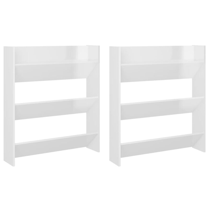 Optimisez votre intérieur avec nos élégantes armoires à chaussures murales 2 pcs Blanc brillant 80x18x90 cm. Elles associent fonctionnalité et esthétique pour s’harmoniser parfaitement avec votre décoration. Avec trois compartiments inclinables, ces meubles sont parfaits pour conserver vos souliers, des baskets décontractées aux bottines élégantes, dans un ordre impeccable. En les accrochant au mur, vous libérez de l’espace au sol, rendant votre entrée plus accueillante et ordonnée. Ces structures sont idéales pour une fixation à la hauteur de votre choix, permettant ainsi une personnalisation selon vos besoins. En outre, ces organisateurs de chaussures se nettoient aisément avec un simple coup de chiffon humide.