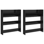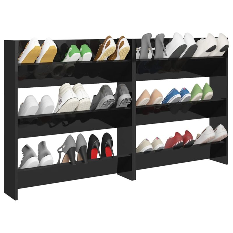 Apportez une touche d’élégance à votre intérieur tout en maintenant vos chaussures rangées avec notre duo d’armoires à chaussures murales 2 pcs Noir brillant 80x18x90 cm. Ces pièces s’harmonisent parfaitement avec divers décors grâce à leur finition noire brillante et leur conception épurée. Elles sont pourvues de trois compartiments basculants chacune, vous permettant d’ordonner esthétiquement vos souliers.