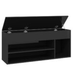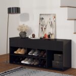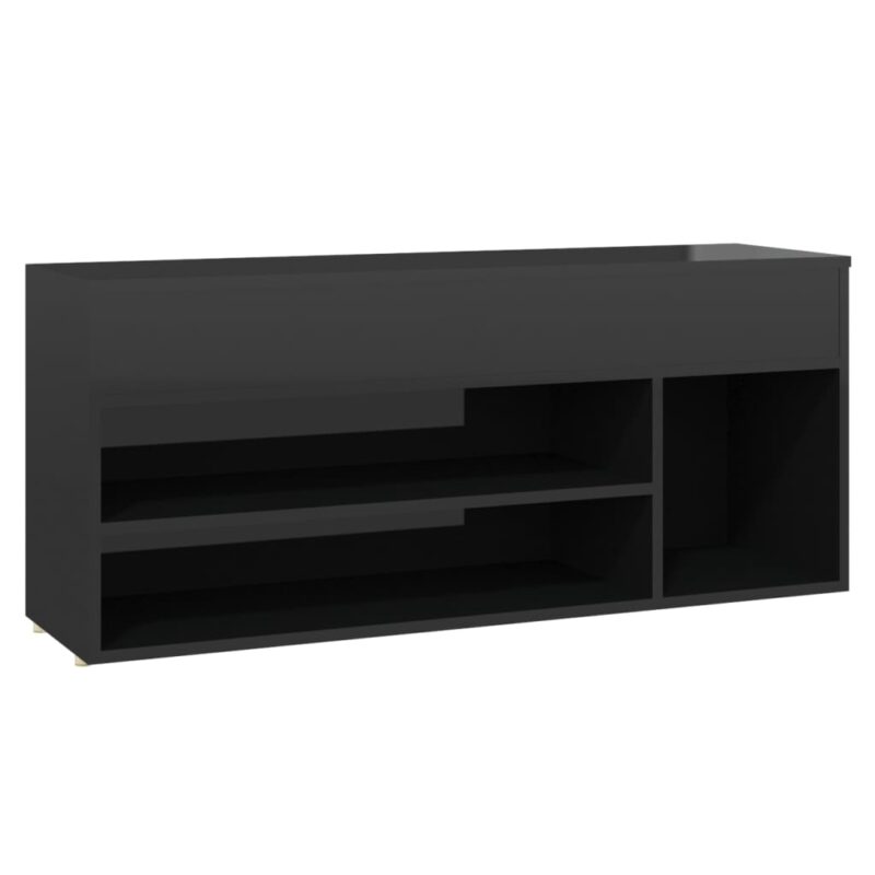 Chic et pratique, le Banc à chaussures Noir brillant 105x30x45 cm Aggloméré vous invite à transformer votre entrée ou votre chambre. Avec son allure raffinée, ce meuble ne se contente pas de maintenir l’ordre parmi vos paires de chaussures, il enjolive aussi votre espace de vie. Vous aurez l’aise de placer vos chaussures sur deux étagères, tandis qu’un compartiment latéral et un espace de rangement sous le siège sont disponibles pour vos accessoires ou livres. Son plateau supérieur, plat et stable, vous permet de vous assoir sereinement pour chausser vos souliers ou d’exposer vos objets de décoration favoris comme des cadres photos, des bouquets ou divers bibelots.