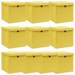 Ces boîtes de rangement et couvercles 10 pcs Jaune 32x32x32cm Tissu s’avèrent être une solution efficace pour optimiser votre espace. Leur capacité à se plier vous aide à épargner de l’espace précieux lorsque vous ne les utilisez pas. De plus, les couvercles qui les accompagnent sont idéals pour prévenir l’accumulation de poussière, conservant ainsi la propreté de vos objets rangés.