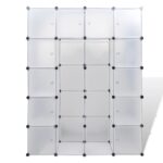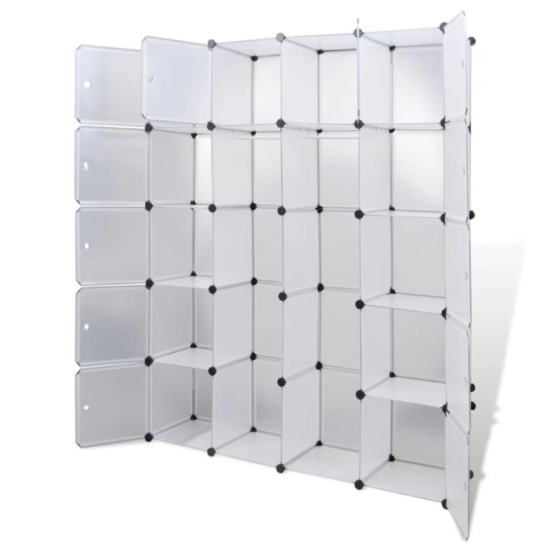 Embellissez votre intérieur avec ce cabinet modulable avec 14 compartiments blanc 37x146x180,5 cm, alliant élégance et fonctionnalité. Conçu pour offrir une protection optimale à vos textiles et souliers contre la poussière et les impuretés, il est constitué de matière plastique avec une structure en acier chromé, s’assurant ainsi facilité d’entretien et longévité. Grâce à ses nombreuses configurations possibles, vous pourrez maximiser votre espace de manière efficace. Il est toutefois recommandé de manier les étagères avec précaution et de maintenir l’armoire loin de toute source de chaleur ou de flammes.