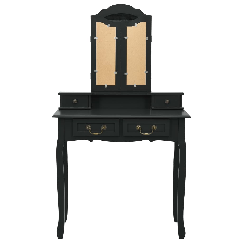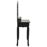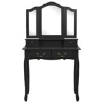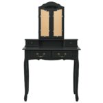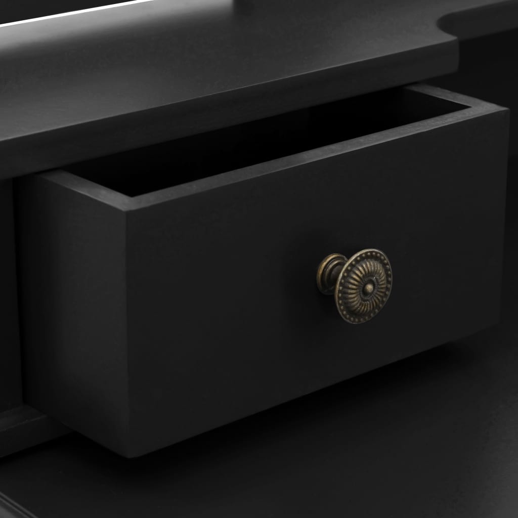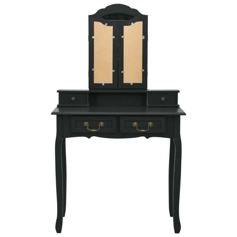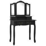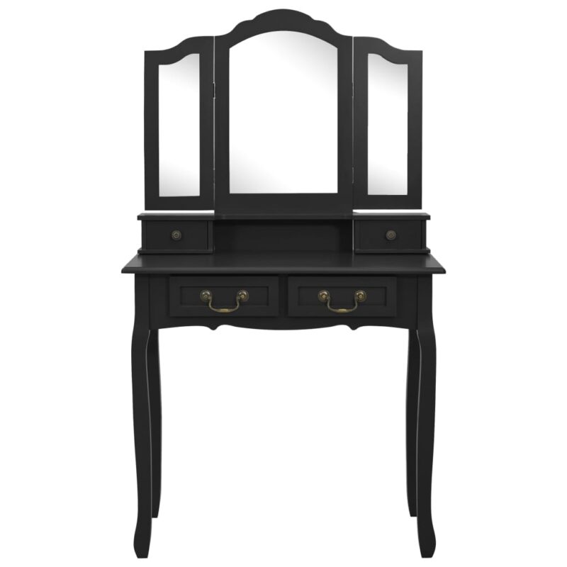 Embark on a sophisticated beauty routine with the Ensemble de coiffeuse avec tabouret Noir 80x69x141 cm Paulownia