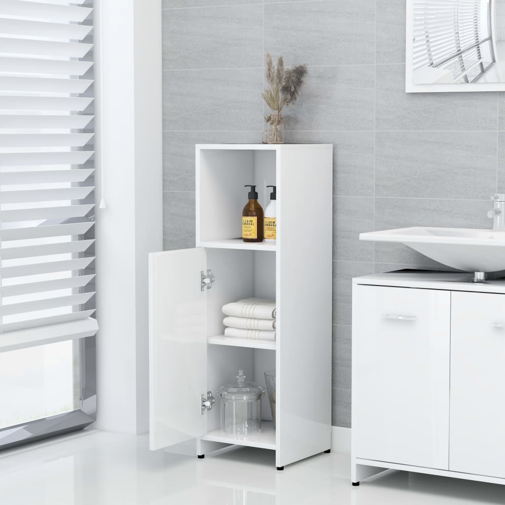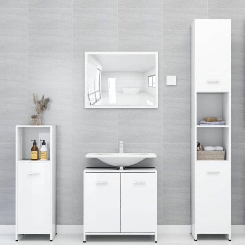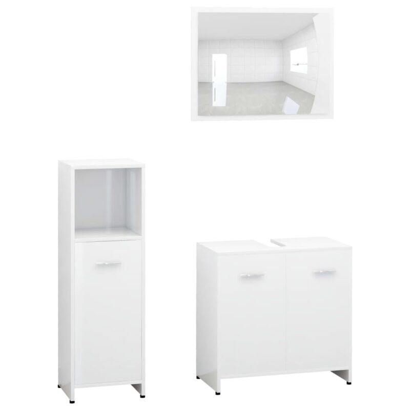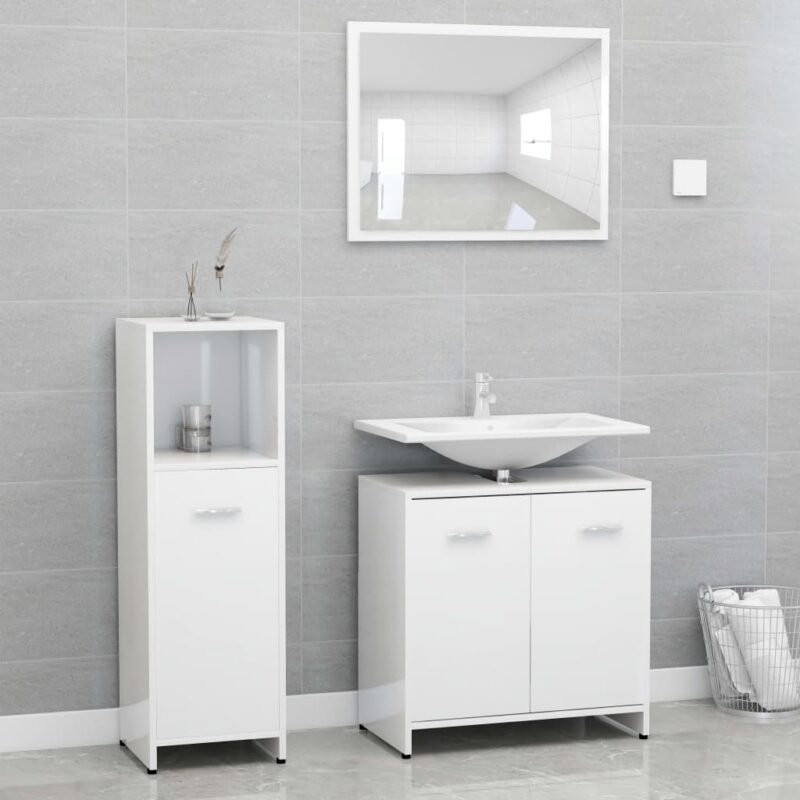 Donnez du style et de la fonctionnalité à votre salle d’eau avec cet ensemble de meubles de bain 3 pcs au fini blanc brillant. Combinant esthétique épurée et praticité, il comprend une armoire intermédiaire, une armoire sous-vasque et un miroir raffiné pour harmoniser votre espace. Réalisée avec un aggloméré de qualité, cette gamme assure une durabilité et une solidité exemplaires.
