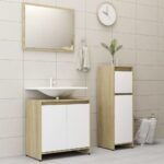 Ajoutez une touche de raffinement et d’organisation à votre salle d’eau avec notre Ensemble de meubles de bain 3pcs Blanc chêne sonoma Aggloméré. Cet ensemble est constitué d’une armoire murale, d’un meuble sous-vasque élégant et d’un miroir assorti, le tout offrant une solution de rangement esthétique et fonctionnelle. Grâce à la fabrication en aggloméré de qualité, cet ensemble promet solidité et endurance au fil du temps. La spacieuse armoire murale est équipée d’une porte, d’un tiroir et de deux étagères, idéales pour ordonner vos essentiels de salle de bain. Le meuble sous-vasque, avec son compartiment et ses deux portes, permet de garder à portée de main vos produits de beauté et accessoires. L’ensemble est couronné par un miroir qui embellit non seulement votre espace mais agrandit aussi visuellement la pièce. Un simple coup de chiffon humide suffit à entretenir la propreté de l’ensemble.