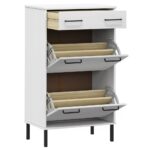 Dites adieu au bazar de chaussures et accueillez l’ordre dans votre foyer avec l’Étagère à chaussures et pieds en métal Blanc Bois de pin OSLO. Ce meuble d’une pureté élégante fabriqué à partir de bois de pin robuste ajoute une touche rustique grâce à son grain distinct et ses nœuds naturels. Avec ses sections dédiées – un tiroir pratique et deux portes battantes – vous bénéficiez d’un volume de rangement considérable pour tous types et tailles de chaussures.