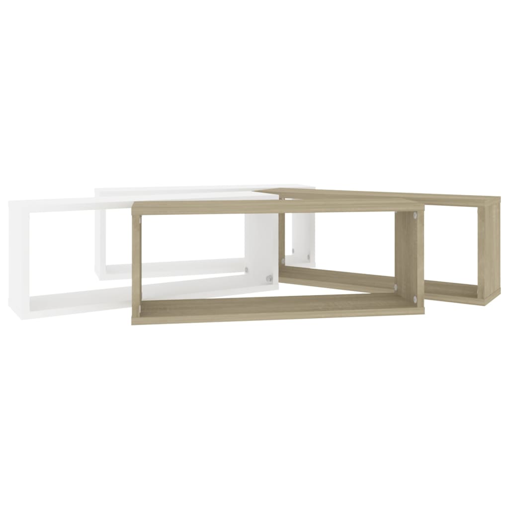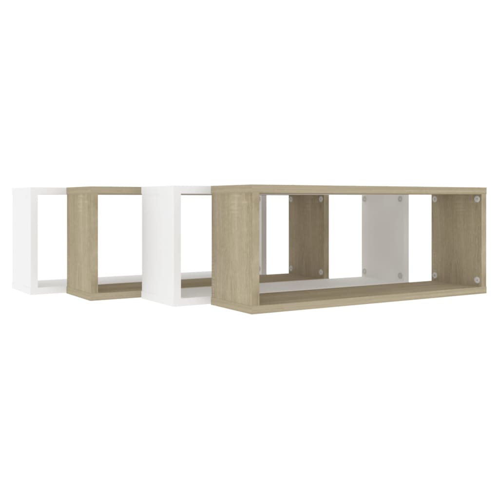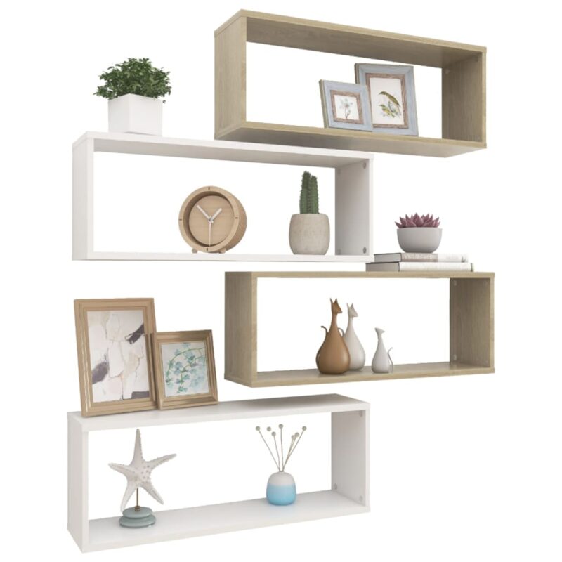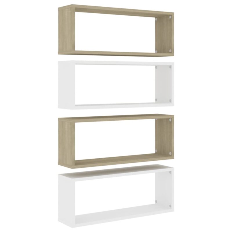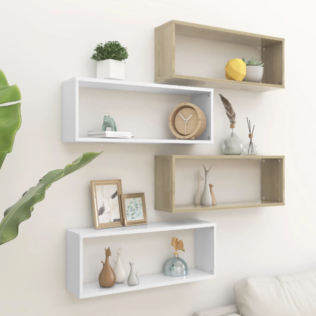 - Un ensemble de 4 étagères cube murales blanches et chêne, prêtes à être assemblées et installées