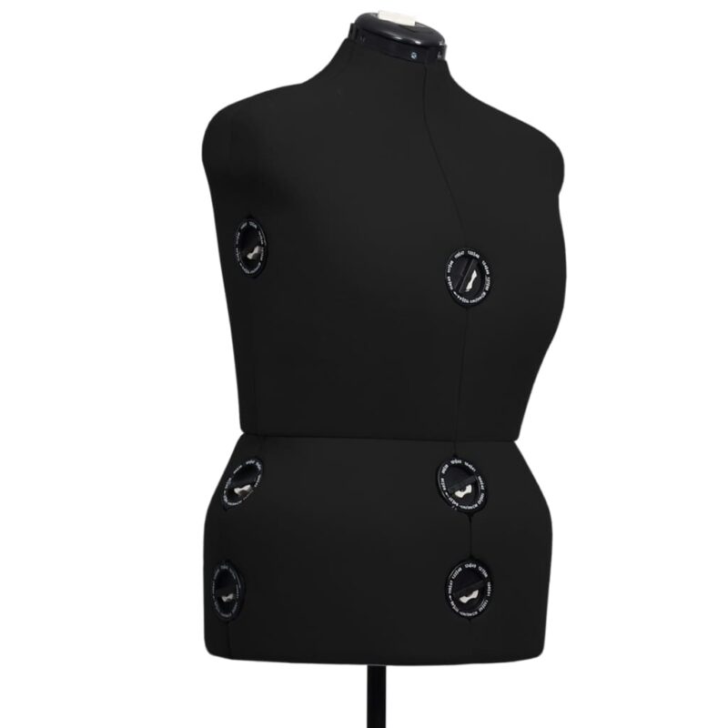 Un design sophistiqué et une coloration noire élégante caractérisent ce buste, alors que la robustesse est garantie par un matériel conçu à partir de polyester et d’ABS. Que cela soit pour des expositions ou pour des ajustements de couture, les multiples réglages du buste, de la taille et des hanches s’effectuent aisément grâce à des roues rotatives pratiques.