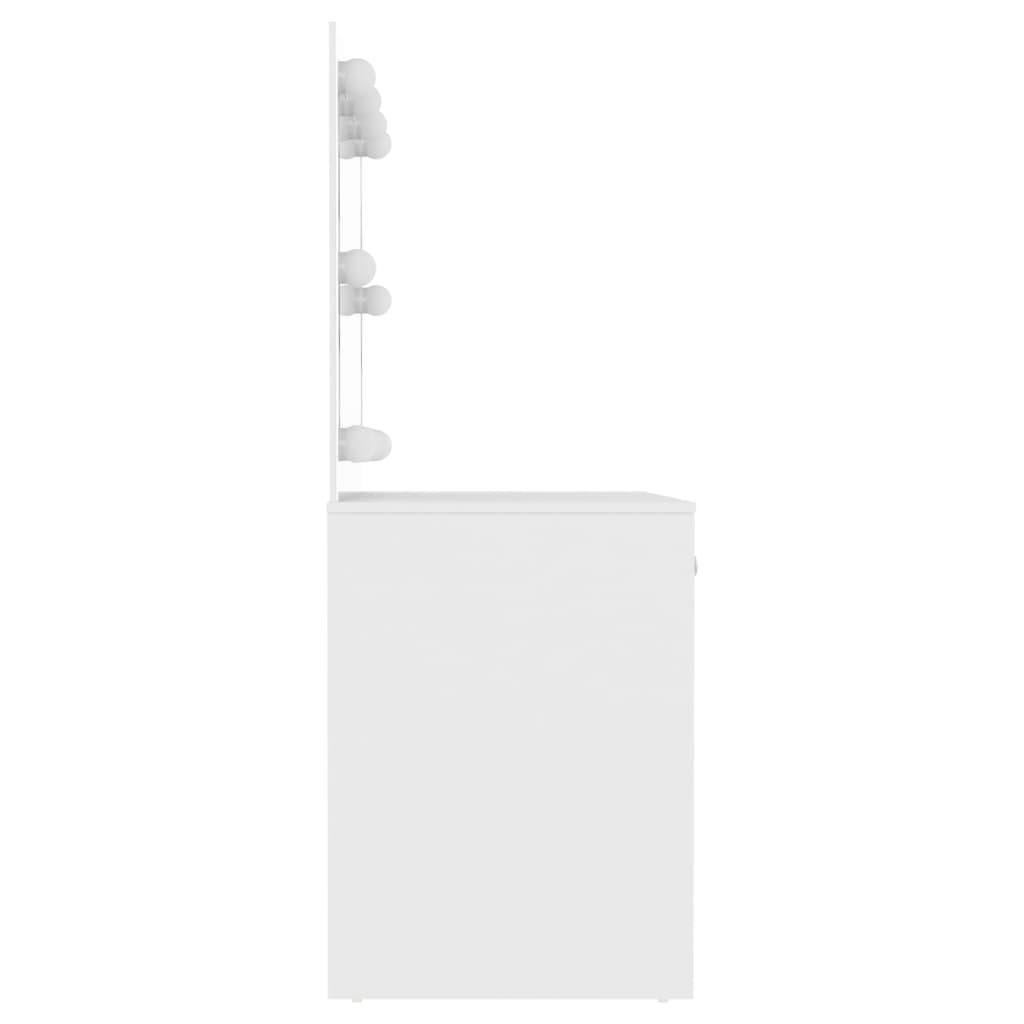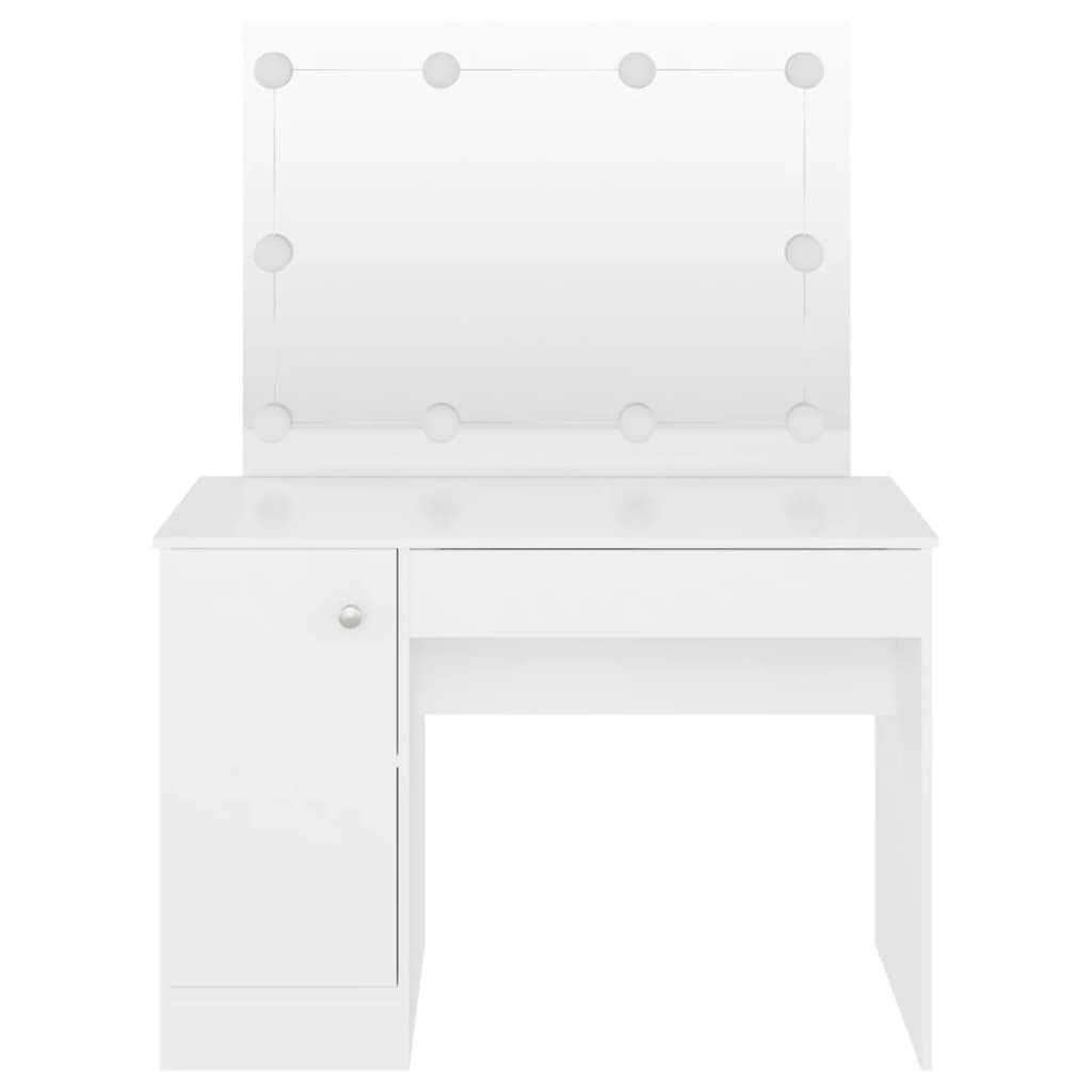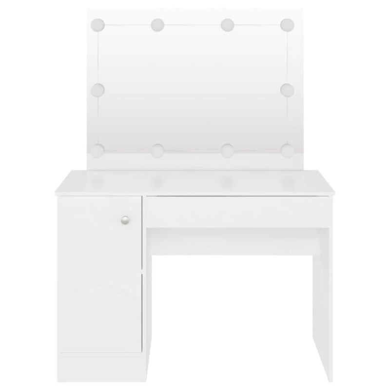 Cette table de maquillage avec éclairage LED 110x55x145 cm MDF Blanc est conçue pour transformer vos routines de beauté en moments de pur plaisir. Construction en MDF robuste et finition en mélamine, cette coiffeuse se démarque par sa silhouette moderne et épurée. L’espace généreux qu’elle propose facilite l’organisation de vos indispensables beauté, et tout reste à portée de main. Son miroir élégant, encadré d’ampoules LED, non seulement complète l’ensemble avec finesse mais illumine aussi votre visage pour un maquillage parfait.